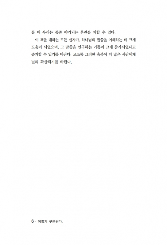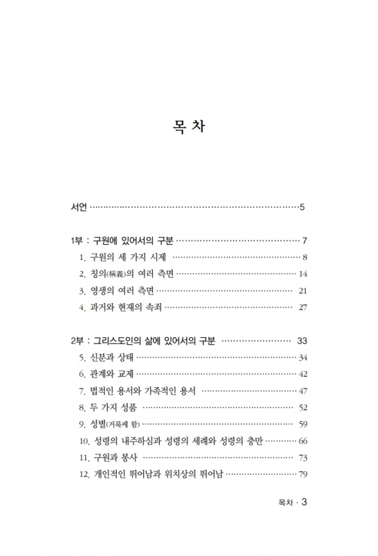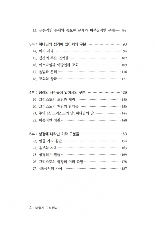 서언 1부 : 구원에 있어서의 구분 1. 구원의 세 가지 시제 2. 칭의(稱義)의 여러 측면 3. 영생의 여러 측면 4. 과거와 현재의 속죄7 2부 : 그리스도인의 삶에 있어서의 구분 5. 신분과 상태 6. 관계와 교제 7. 법적인 용서와 가족적인 용서 8. 두 가지 성품 9. 성별(거룩케 함) 10. 성령의 내주하심과 성령의 세례와 성령의 충만 11. 구원과 봉사 12. 개인적인 뛰어남과 위치상인 뛰어남 13. 근본적인 문제와 중요한 문제와 비본질적인 문제 3부 : 하나님의 섭리에 있어서의 구분 14. 여러 시대 15. 성경의 주요 언약들 16. 이스라엘과 이방인과 교회 17. 율법과 은혜 18. 교회와 왕국 4부 : 장래의 사건들에 있어서의 구분 19. 그리스도의 초림과 재림 20. 그리스도의 재림의 단계들 21. 주의 날, 그리스도의 날, 하나님의 날 22. 이중적인 성취 5부 : 성경에 나타난 기타 구분들 23. 일곱 가지 심판 24. 음부와 지옥 25. 성경의 비밀들 26. 그리스도의 영광의 여러 측면 27. 4복음서의 차이 |