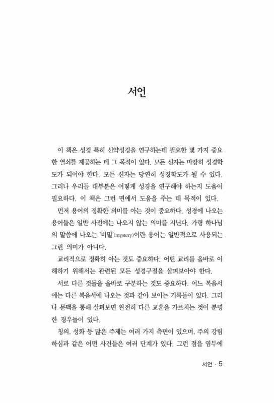 이 책의 목적은 성경 특히 신약성경을 연구하는데 필요한 몇 가지 중요한 열쇠를 제공해주는데 있습니다. 모든 신자는 마땅히 성경학도가 되어야 합니다. 모든 신자는 당연히 성경학도가 될 수 있습니다. 그러나 우리들 대부분은 어떻게 성경을 연구해야 하는지 도움이 필요합니다. 이 책은 그런 면에서 도움을 주는데 목적이 있습니다. 먼저 용어의 정확한 의미를 아는 것이 중요합니다. 성경에 나오는 용어들은 일반 사전에는 나오지 않는 의미를 지닙니다. 가령 하나님의 말씀에 나오는 ‘비밀’(mystery)이란 용어는 일반적으로 사용되는 그런 의미가 아닙니다. 교리적으로 정확히 아는 것도 중요합니다. 어떤 교리를 올바로 이해하기 위해서는 관련된 모든 성경구절을 살펴보아야 합니다. 서로 다른 것들을 올바로 구분하는 것도 중요합니다. 어느 복음서에는 다른 복음서에 나오는 것과 같아 보이는 기록들이 있습니다. 그러나 문맥을 통해 살펴보면 완전히 다른 교훈을 가르치는 것이 분명한 경우들이 있습니다. 칭의, 성화 등 많은 주제들은 여러 가지 측면이 있으며, 주의 강림하심과 같은 어떤 사건들은 여러 단계가 있습니다. 그런 점을 염두에 둘 때 우리는 종종 야기되는 혼란을 피할 수 있습니다. 이 책을 대하는 모든 신자들이, 하나님의 말씀을 이해하는데 크게 도움이 되었으며, 그 말씀을 연구하는 기쁨이 크게 증가되었다고 증거할 수 있기를 바랍니다. 모쪼록 그러한 축복이 더 많은 사람들에게 널리 확산되기를 소원합니다. |